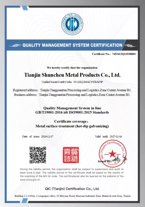 கால்வனைசிங் செயல்முறை: ஹாட்-டிப் கால்வனைசிங் (துத்தநாக அடுக்கு தடிமன் ≥ 85μm), எலக்ட்ரோ-கால்வனைசிங் (துத்தநாக அடுக்கு தடிமன் ≥ 12μm), GB/T 13912-2020 தரநிலைக்கு இணங்குகிறது;