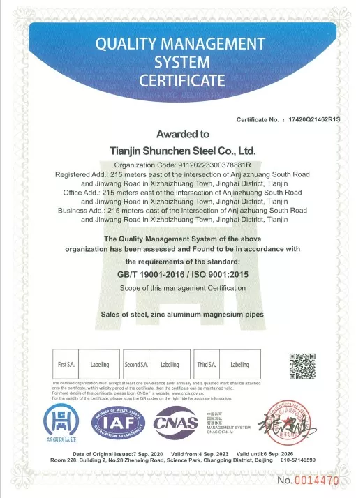தரநிலைகள்: GB/T 3091-2015 "குறைந்த அழுத்த திரவ போக்குவரத்துக்கான வெல்டட் ஸ்டீல் பைப்புகள்", GB/T 13912-2020 "ஹாட்-டிப் கால்வனேற்றப்பட்ட ஸ்டீல் குழாய்கள்". தயாரிப்பு மூன்றாம் தரப்பு சோதனையில் தேர்ச்சி பெற்றுள்ளது மற்றும் சோதனை அறிக்கை உள்ளது.