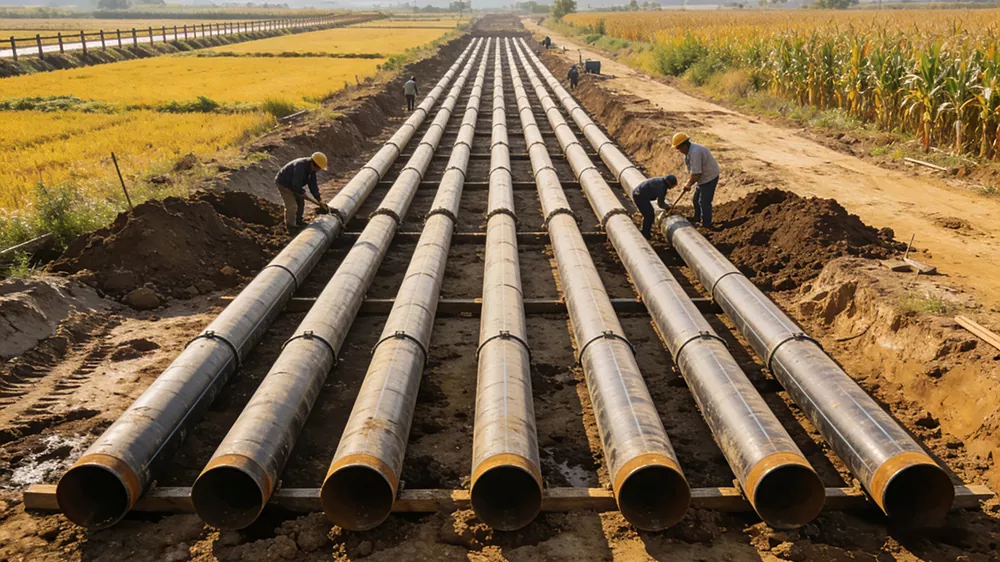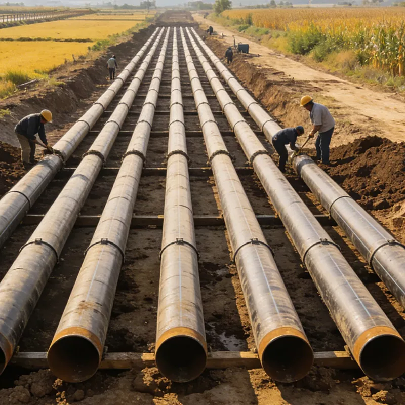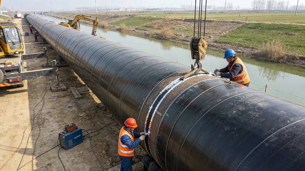 பொருந்தக்கூடிய காட்சிகள்: பெரிய அளவிலான நீர் மாற்றுத் திட்டங்கள், நீர் பரிமாற்றத் திட்டங்கள், வெள்ளக் கட்டுப்பாடு மற்றும் வடிகால் திட்டங்கள், விவசாய நிலப் பாசனத்திற்கான பிரதான குழாய்கள், குடிநீருக்கான நீர் வழங்கல் திட்டங்கள், தீவு நீர் வழங்கல் திட்டங்கள் போன்றவை. முக்கியத் தேவைகள் அதிக ஓட்டம் திறன், அரிப்பு எதிர்ப்பு மற்றும் நீர் அழுத்த எதிர்ப்பு. ஆற்றுப்படுகைகள், உப்பு-பாதிக்கப்பட்ட நிலங்கள் போன்ற சிக்கலான சூழல்களுக்கு அவை மாற்றியமைக்கப்படலாம். அவை நீர் அரிப்பு மற்றும் புவியியல் வீழ்ச்சியைத் திறம்பட எதிர்த்து, நீர் ஆதாரங்களின் நிலையான பரிமாற்றத்தை உறுதிசெய்து, நீர் பாதுகாப்புத் திட்டங்களின் பாதுகாப்பான செயல்பாட்டிற்கு உத்தரவாதம் அளிக்கும். முக்கிய தேசிய நீர் பாதுகாப்புத் திட்டங்களில் அவை முக்கிய துணைப் பங்கு வகிக்கின்றன. காட்சி விளக்கம்: ஜிங்காய் நீர் மாற்றுத் திட்டத்தின் கட்டுமான தளத்தில், பெரிய விட்டம் கொண்ட சுழல் குழாய்கள் பிரதான குழாய் பதிக்கப் பயன்படுத்தப்படுகின்றன. குழாய்கள் ஆறுகள் அல்லது விவசாய நிலங்கள் வழியாக செல்கின்றன, மேலும் தொழிலாளர்கள் இடைமுக சீல் சிகிச்சையை மேற்கொள்கின்றனர். தீவு நீர் வழங்கல் திட்ட தளத்தில், 3PE எதிர்ப்பு அரிப்பு தொழில்நுட்பத்துடன் கூடிய பெரிய விட்டம் கொண்ட சுழல் குழாய்கள் கடல் நீர் அரிப்பை எதிர்க்கவும் மற்றும் தீவு மற்றும் நிலப்பகுதிக்கு இடையே உள்ள நீர் ஆதாரங்களின் ஒன்றோடொன்று தொடர்பை அடையவும் பயன்படுத்தப்படுகின்றன.