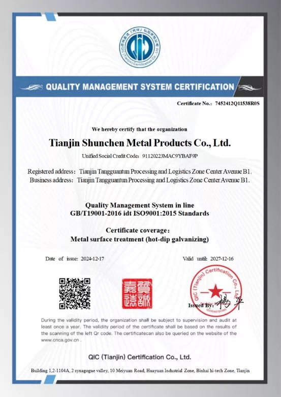 நம்பகமான தரத்திற்கு ஷுன்செனைத் தேர்ந்தெடுக்கவும். Q235B அல்லது Q355B இன் உயர்தர எஃகு, அரிப்பைத் தடுப்பதற்காக ஹாட்-டிப் கால்வனைசிங் மூலம் செயலாக்கப்படுகிறது. துத்தநாகப் பானையின் வெப்பநிலையானது 450-460 டிகிரி செல்சியஸ் வரம்பிற்குள் துல்லியமாக கட்டுப்படுத்தப்பட்டு, துத்தநாக பூச்சுகளின் வலுவான ஒட்டுதல் மற்றும் தவறவிட்ட பகுதிகள் இல்லை. எங்கள் தயாரிப்புகள் ISO9001 தர அமைப்பு சான்றிதழுடன் இணங்குகின்றன மற்றும் மூன்றாம் தரப்பு துத்தநாக பூச்சு ஆய்வு அறிக்கைகளால் ஆதரிக்கப்படுகின்றன.